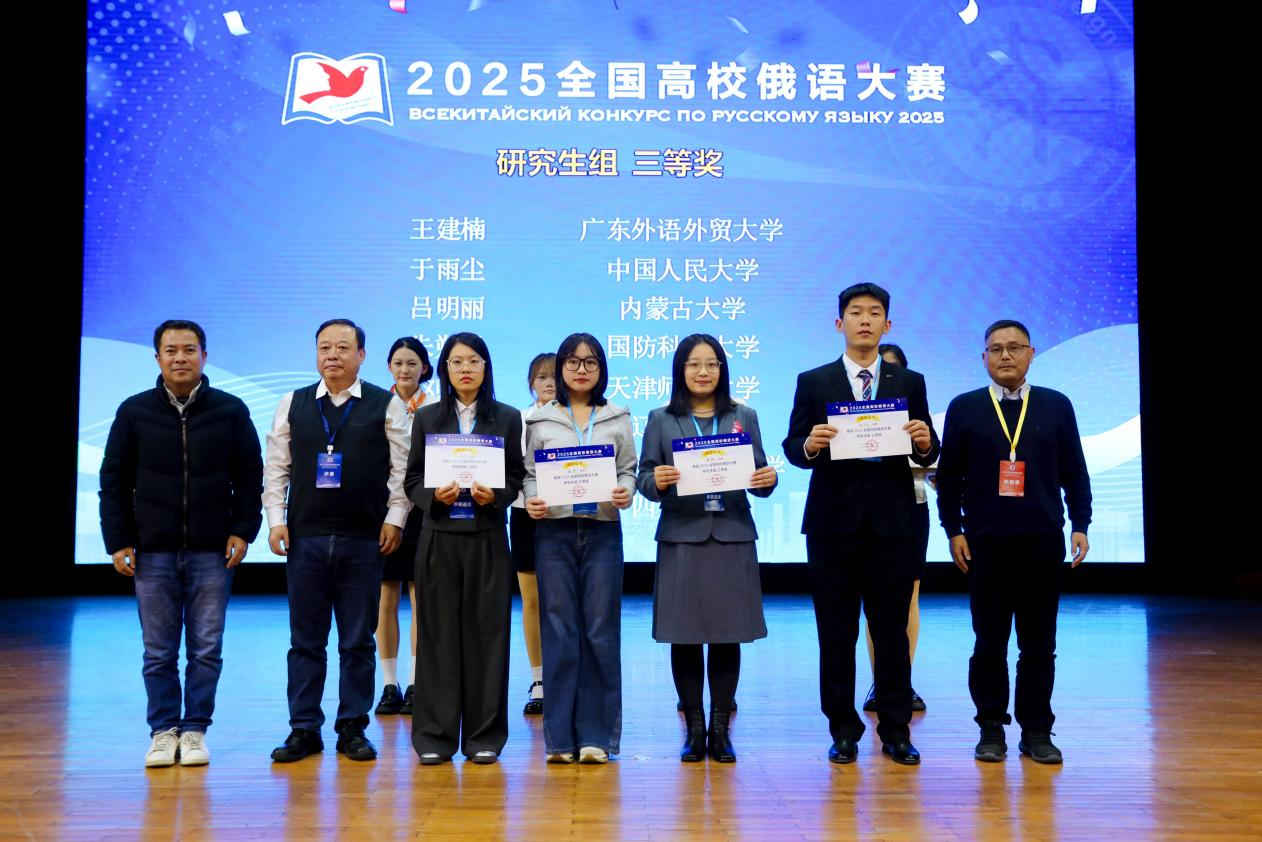 10月25日至26日,由教育部主办、大连外国语大学承办的2025全国高校俄语大赛在大连举行。我校外国语学院俄语系潘玲同学荣获研究生组全国三等奖,并成功获得教育部公派出国留学资格。丁美琳同学荣获低年级组优秀奖。