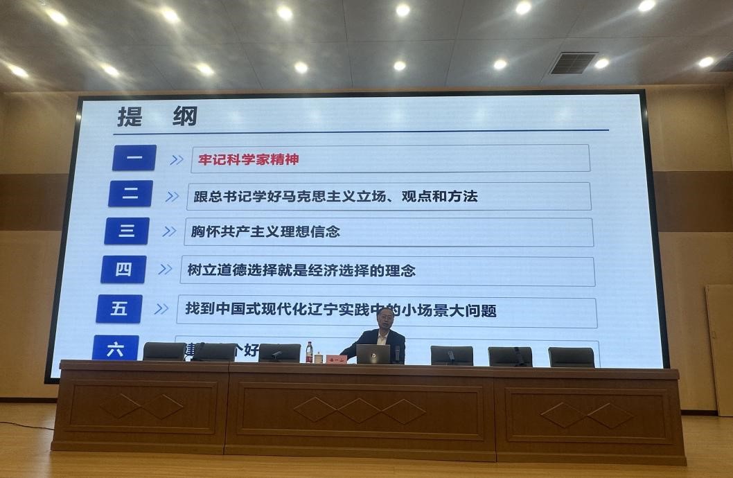 潘一山从“牢记科学家精神”“跟总书记学好马克思主义立场、观点和方法”“胸怀共产主义理想信念”“树立道德选择就是经济选择的理念”“找到中国式现代化辽宁实践中的小场景大问题”“养成十个好习惯”等6个方面为同学们做了精彩讲授。