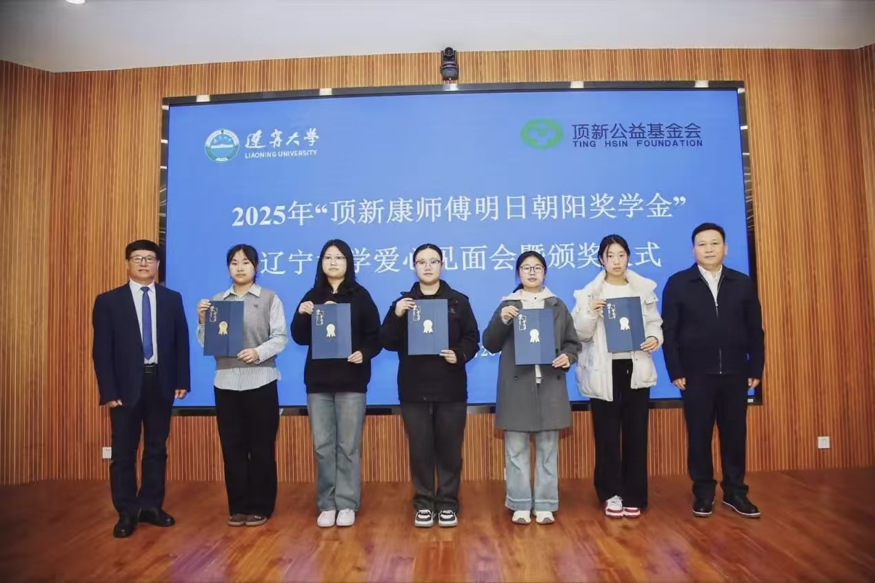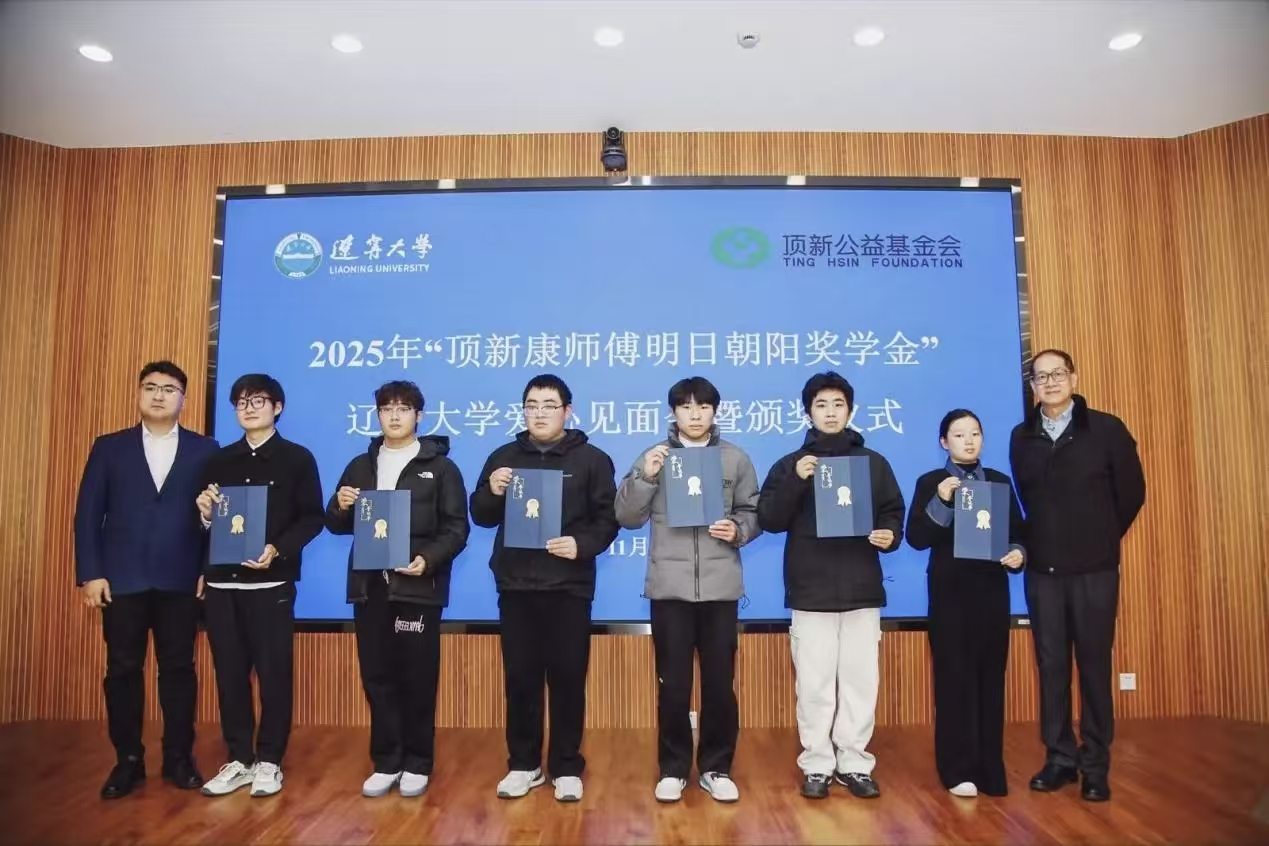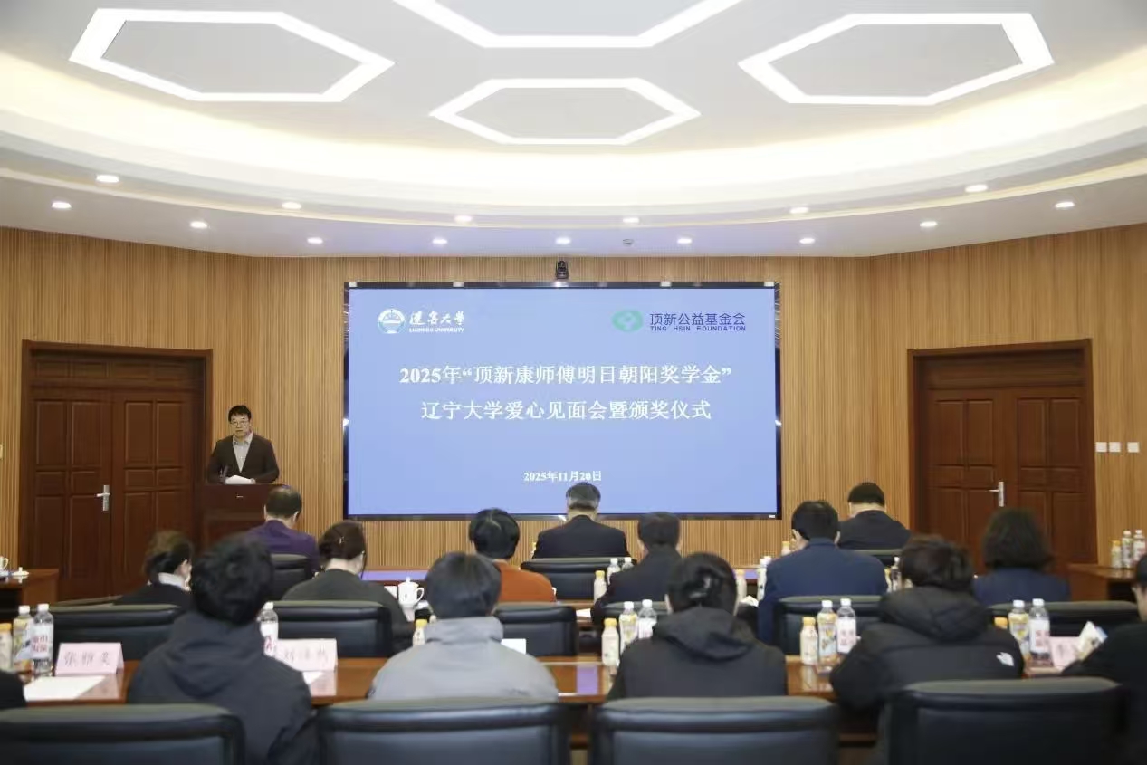 11月20日,2025年“顶新康师傅明日朝阳奖学金”辽宁大学爱心见面会暨颁奖仪式在辽宁大学蒲河校区举行。辽宁大学党委书记、中国工程院院士潘一山,辽宁省台办交流处处长李松涛出席活动。顶新公益基金会理事长陈志团、副秘书长滕鸿年、副秘书长司然,辽宁大学化学院1990级优秀校友、顶新集团康师傅控股公司东北区董事长姜克良,顶巧餐饮集团东蒙地区副总经理李野参加活动。