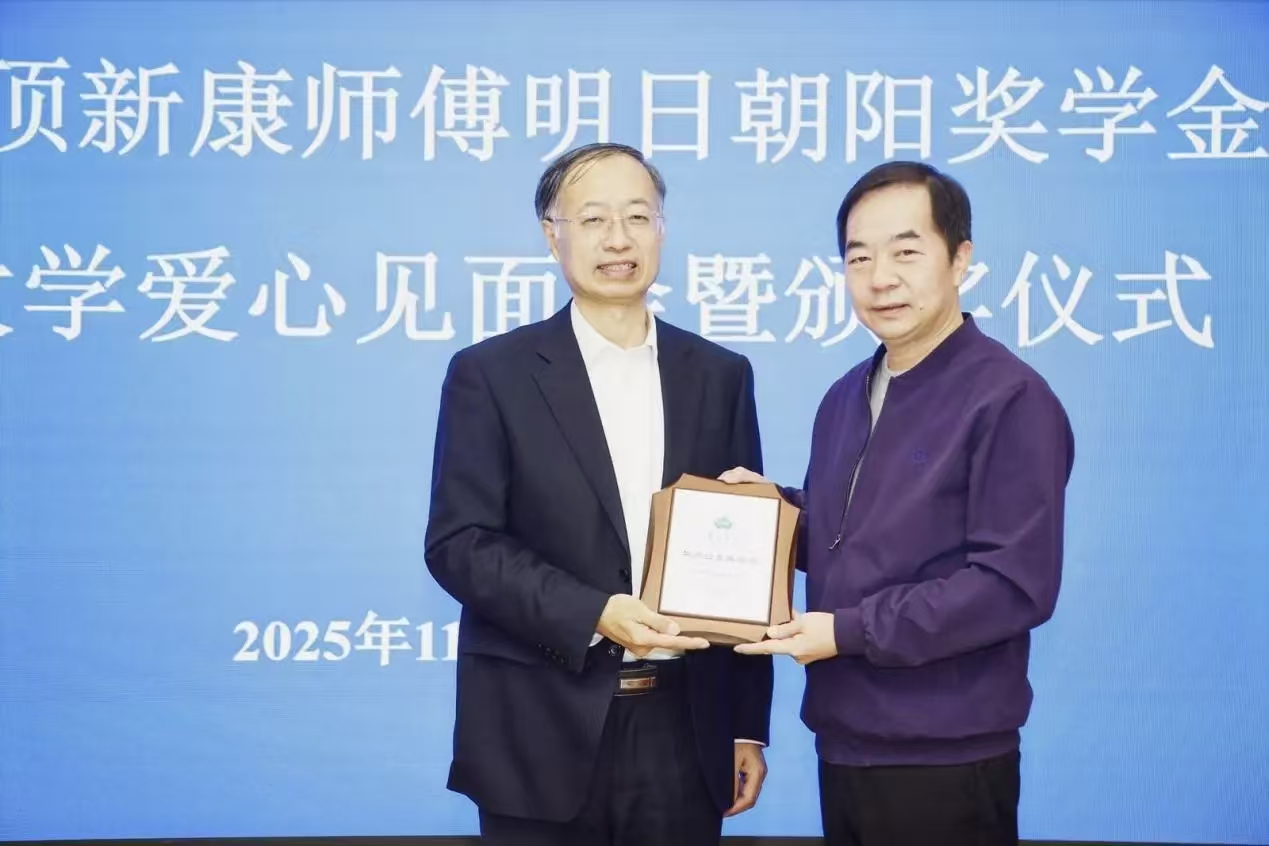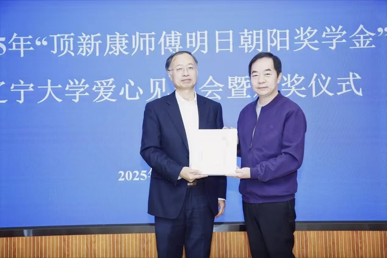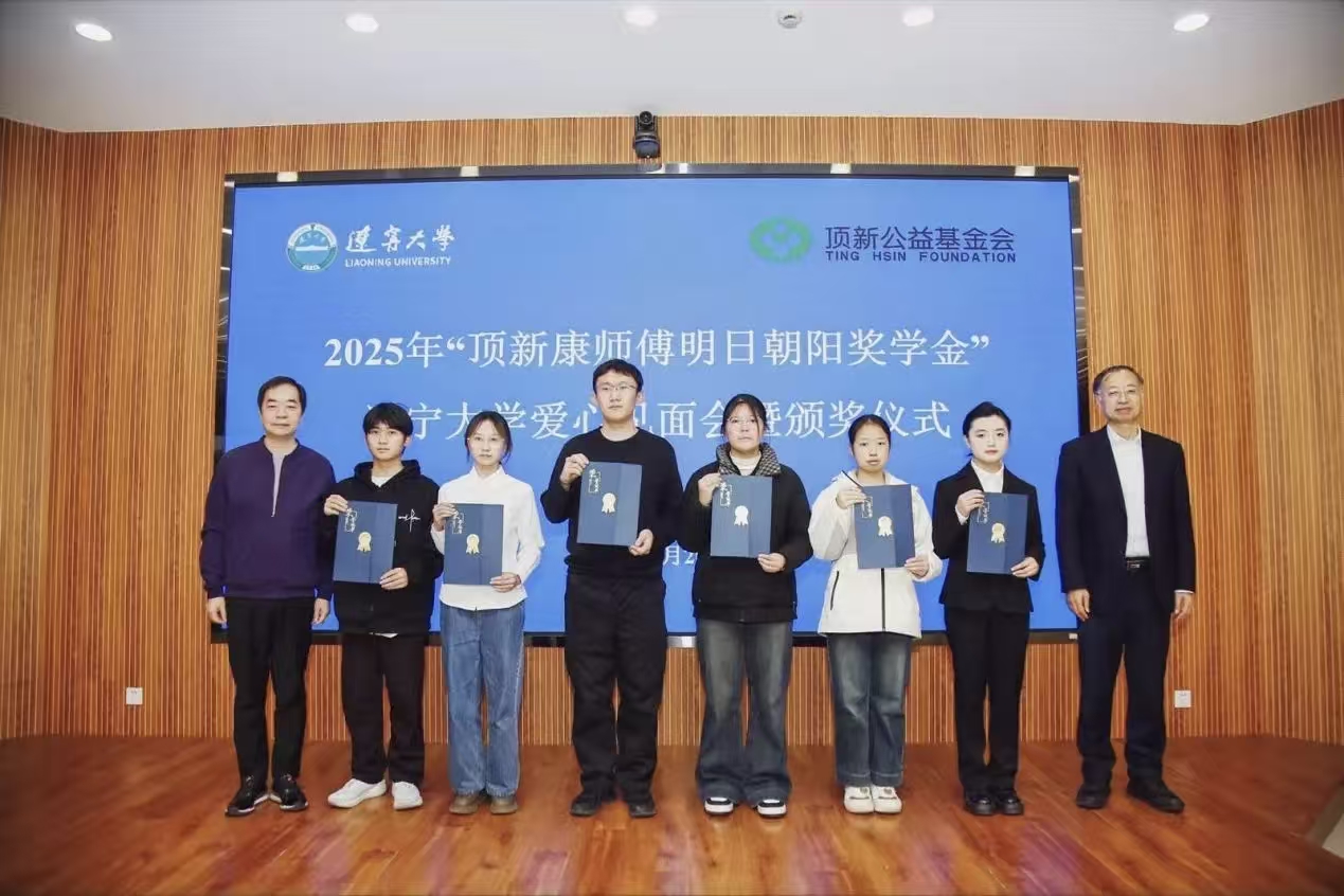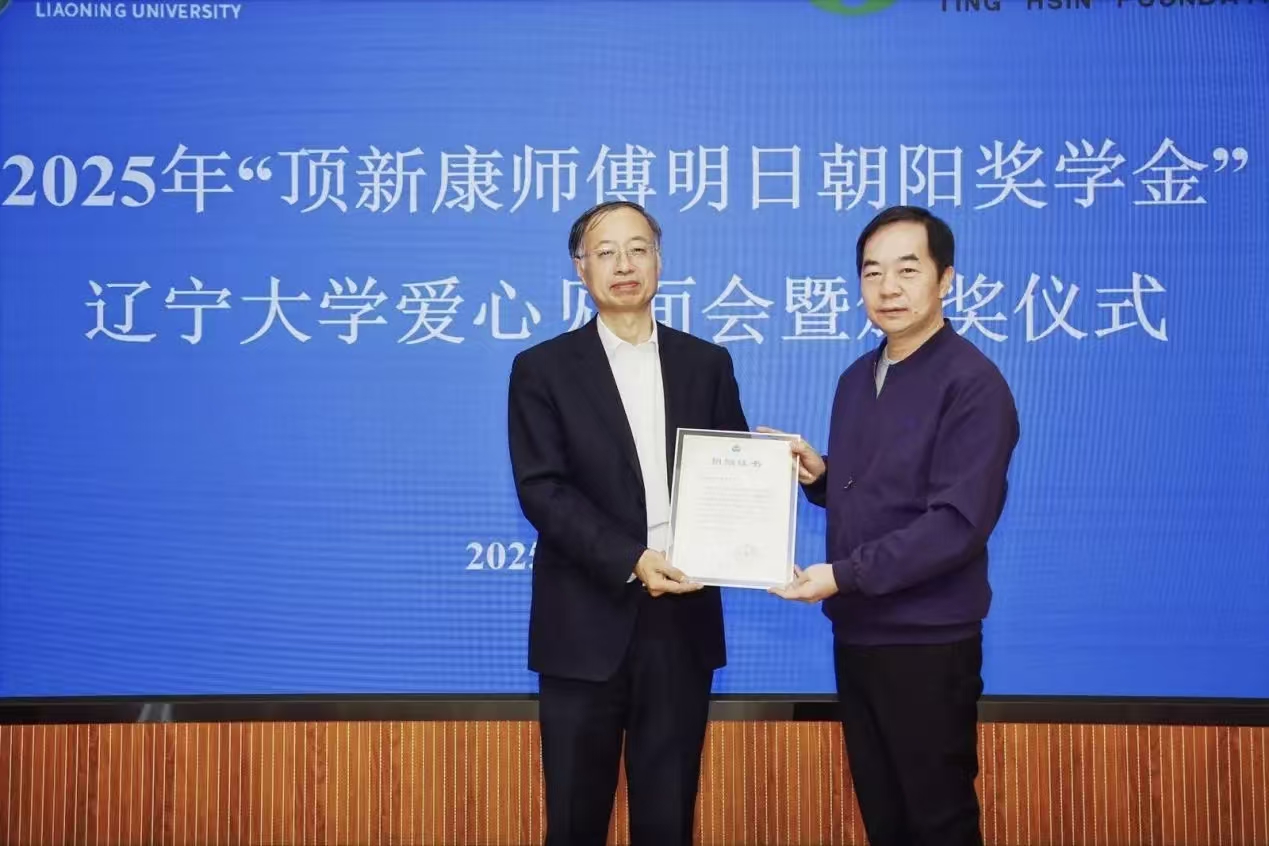 11月20日,2025年“顶新康师傅明日朝阳奖学金”辽宁大学爱心见面会暨颁奖仪式在辽宁大学蒲河校区举行。辽宁大学党委书记、中国工程院院士潘一山,辽宁省台办交流处处长李松涛出席活动。顶新公益基金会理事长陈志团、副秘书长滕鸿年、副秘书长司然,辽宁大学化学院1990级优秀校友、顶新集团康师傅控股公司东北区董事长姜克良,顶巧餐饮集团东蒙地区副总经理李野参加活动。